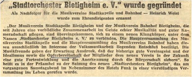 der Stadtkapelle und des Musikvereins Bahnhof sahen, entstand also im Jahre 1965 das Stadtorchester Bietigheim e.V.