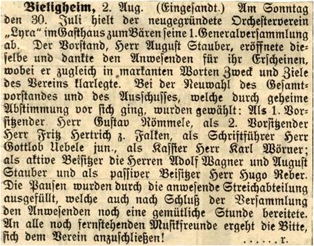Im Jahre 1921 gab es in Bietigheim die beiden Vereine Stadtkapelle